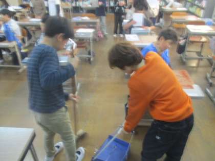 今日のロング昼休みは、エンジョイスマイルで縦割りあそびをしました。前回とは違って、いくつかのグループで一緒になって遊んでいる様子も見受けられとても楽しそうな時間でした。ただ、ロング昼休みの日は、そうじの時間がありません。放課後掃除しようと思っていたところ…担任が教室に戻ると、時間があったのでとほうきやちりとりを手に取って、そうじをしてくれていました。おかげさまで、午後からの授業もきれいな教室で学習することができました。