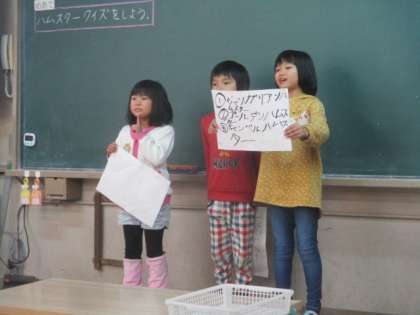 今日はえのき学級の1年生のお友だちに来てもらい、ハムスターのももちゃんクイズに挑戦してもらいました。伝わるように大きな声で伝えたり、一言添えて言葉を言ったりと練習の成果を発揮してくれていました。