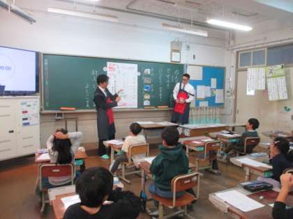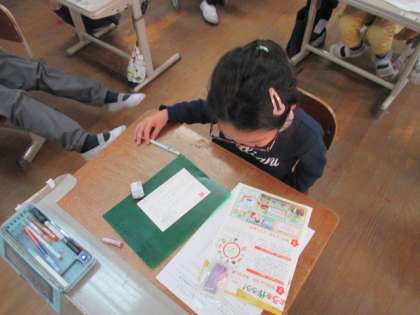 本日3,4時間目は地域の郵便局長さんに来ていただき、年賀状の書き方について教えていただきました、事前に宿題にしていたこともあって「送りたい人の住所を書きます」や「私は寒中見舞い」と、知識はバッチリでした。