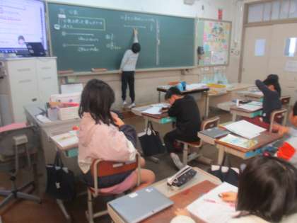 今日の算数の学習では、これまでの学習で習ってきた3分の1や5分の3のような1より小さい数だけでなく、5分の5や3分の4など、1や1より大きい数を表す分数について学習しました。○等分したうちの△つを○分の△と表すという基本のルールに立ち返りながら新たな分数について知ることができました。