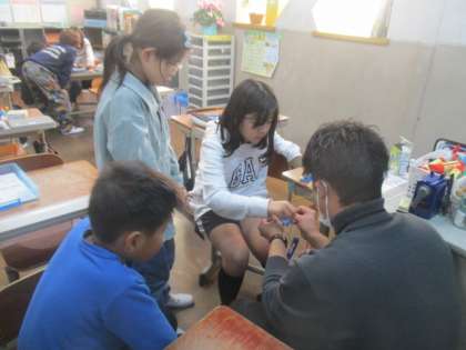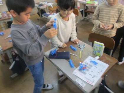 今日の理科の学習では、お互いのキットを持ち寄って、回路を繋ぎ合せ、今までの回路よりも2倍3倍と大きな回路づくりに挑戦しました。どこをどのようにつなげばよいのか考えながら1つの回路を組み立てていました。無事に明かりがついたときには、喜びの声や拍手が聞こえてきていました。