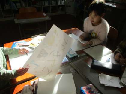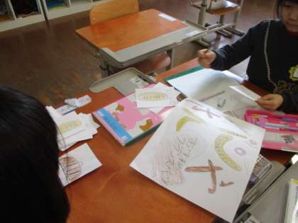 「楽器やさん」「やおやさん」などお店を開いてお店屋さんごっこをするために、売りたいものを決めてカードに書いています。いろんなお店が出来上がってきています。