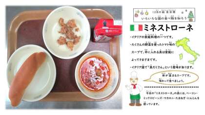 今日の給食は コッペパン(国内産小麦100%) スパイシーチキン(ヨーグルト入り) ミネストローネ です。
