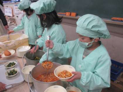 3学期にもなると、給食の配膳も完璧です。おかずを入れるのも上手になりました。いろんなところで成長している1年生です。