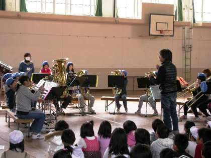 16日(金)体育館で金管バンドのお別れコンサートがありました。6年生にとっては最後の演奏会です。演奏した曲は「鉄腕アトム」「今日の日はさようなら」「上を向いて歩こう」でした。6年生が順にあいさつや曲紹介をし,聴いている子どもたちも曲に合わせて手拍子をしたり口ずさんだりして楽しい時間を過ごしました。