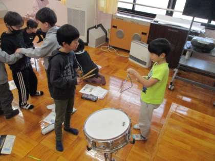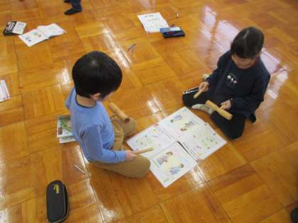 音楽科「いろいろながっきの音をさがそう」の学習では、色々な打楽器をうったり、音を聞いたりしています。今日は、自分の好きな楽器をもって、友だちと楽器でお話することに挑戦しました。「どうリズム打ちをするとお話しているように聞こえますか?」と尋ねると、「二人の速さを合わせる」「リズムよく」とポイントを捉えた発言がありました。それらを踏まえて、ペアで「お話」をしているところです。上手くお話しているペアがたくさんありました。