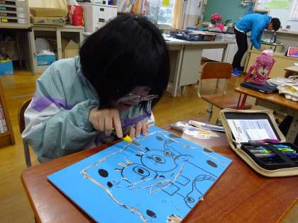 4年生の版画は、初めての彫刻刀を使って作品を作っています。
