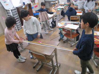 予想をして長さを測ると、なんとピタリ賞がっ!!測れた長さをもとに黒板の大体の長さを求めました。これからも、なが−い長さをはかったり、計算したりする学習が続きます。