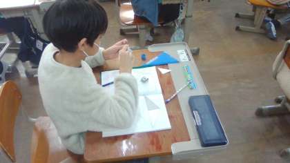 今日は、三角定規に見立てた紙を使って、2種類の三角定規を重ねたり、並べたりして、角の大きさに注目しました。不思議なことに手元の小さな三角定規も先生が使う黒板用の大きな三角定規も角の大きさは同じ。つまり、辺の長さは角の大きさに関係がなく、角の大きさは辺の開き方で決まるということをみんなで学ぶことができました。