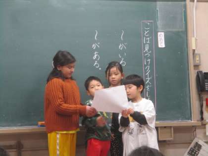 言葉の中にどんな言葉が隠れているでしょうか。グループでクイズを考えて、クイズ大会をしました。「ちりとりの中には、とりがいる」「トラックの中には、トラがいる」など言葉の中からいろんな言葉を見つけていました。