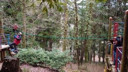 午後の活動は、山の中のアスレチックです。ロープをたぐり、丸太を登り、たくましく進んでいきます。山の中にみんなの元気な声が響きわたっていました。