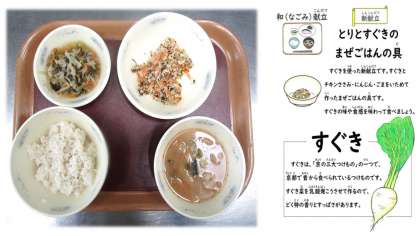 今月の新献立である「とりとすぐきのまぜごはんの具」はすぐきを使った新献立です。すぐきは「京の三大漬け物」で、京都で昔から食べられている漬け物です。そのすぐきをまぜご飯にしました。混ぜご飯だったので、ごはんもよく進み、すぐきの味や食感を味わって食べていました。