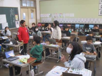 今日は、「What's this ?」「This is a ○○」という表現を使ったクイズになるように、ピクチャークイズを作って、クイズ大会をしました。お題の物を決めて、超アップで撮影した写真をあてずっぽうながらに考え、答えていました。クイズを楽しむ中で、いろいろな英語や表現に慣れ親しんでいくことができました。