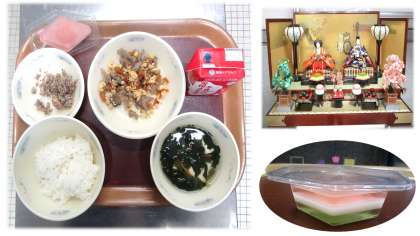 今日の給食は ごはん 牛乳 ちらしずし(具) さばそぼろ すまし汁 で、ひなまつりの行事献立です。