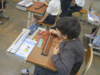 算数の学習では、昨日から2時間続きでそろばんの学習をしています。昨日は、基本的なたし算、ひき算、今日は、5だまの動かし方やくり上がり、くり下がりなどの計算をしました。○に何を足したら10になるか、10から□を引いたらいくつ残るかとたまの動かし方に直結する大事な考え方を確認しながら進めました。