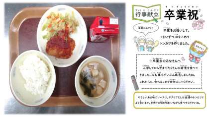 今日の給食は ごはん 牛乳 トンカツ 野菜のソテー みそ汁 で、卒業祝の献立です。