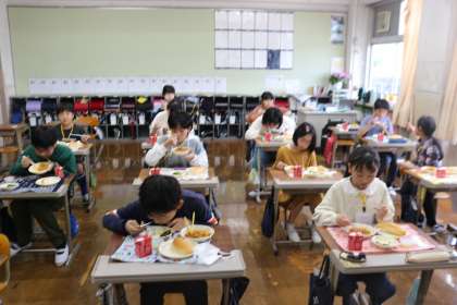 今日から給食が始まりました。待ちに待った給食です。じっくり味わっている子や、おかわりをほしがる子どもたちもたくさんいて、それぞれが久しぶりの給食を満喫していました。やはり学校は給食があって成り立っているとつくづく感じました。たくさん食べ、たくさん学び、みんなで健康的に育っていきたいですね。
