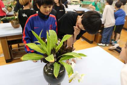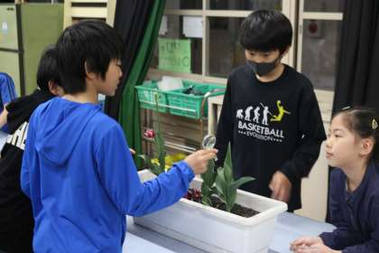 アブラナの花のつくりは理解し、どの部分が実になることもわかった子どもたち。他の植物ならどうなのかという問いをもちました。そこで、学校の玄関に飾られているお花たちに来ていただき、みんなでローテーションしながら観察をしていきました。「この花はアブラナと同じ!」「あれ?めしべがないですよ!」「これはおしべの数が多いです!」といった学びを生かしたつぶやきがたくさん聞こえました。その後にチューリップを見直し、「チューリップのがくはどこなのか」という問いについて考えました。葉の部分?花の下にある小さなところ?