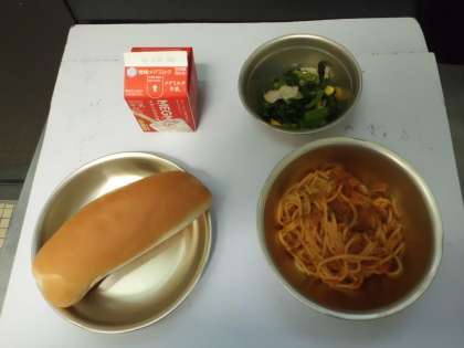 今日の給食は,小型コッペパン・牛乳・スパゲティのミートソース煮・ほうれん草のソティ・りんごゼリーでした。今日は1年生の入学をお祝いする献立でした。スパゲティは子どもたちが好きな献立です。1年生の中には,ほうれん草が苦手な子もいましたが,最後まで残すことなく頑張って食べていました。ゼリーも楽しみにしていました。