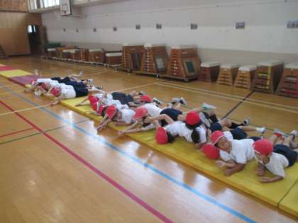 2時間目の体育科「体ほぐしの運動」では、マットの上で転がりながら上に乗っている友だちを先へ運ぶ「人間ベルトコンベヤー」に取り組みました。初めこそ「進みません!」、「どうやるんですか?」と言っていた子どもたちでしたが、慣れてくるとスイスイ友だちを前方へ運ぶことができていました。