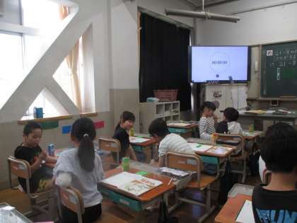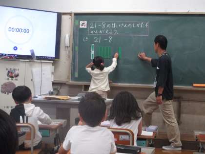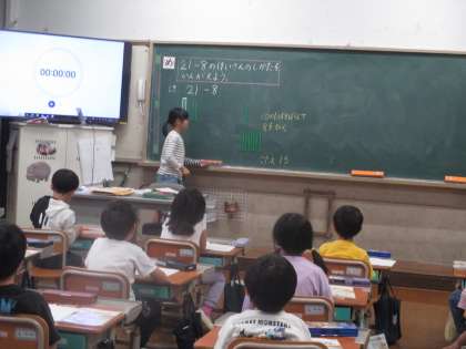 計算の考え方を,ペアで伝えあって,全体でも自分の言葉で発表することができています。数え棒を実際に動かしながら話すと分かりやすいですね。みんなで共有してさらに高めあっています。