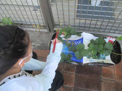 先日種をまいた畑に、水やりをしました。苺も可愛らしいお花が咲き、少しずつ育ってきています。キャベツには幼虫がいて、ごはんを食べている姿が可愛かったですね。