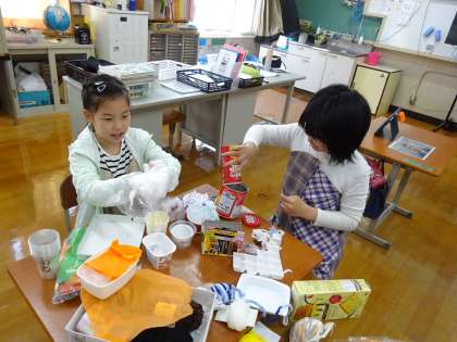 空き箱、毛糸、お花紙、綿、、、いろんな材料を使って、食べ物を表現しました。