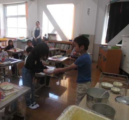 昨年2年生が一生懸命育てたアサガオの色水で描いた封筒とタネを1年生へ渡しました。生活科の学習で1年生も頑張って育てたいと思います。