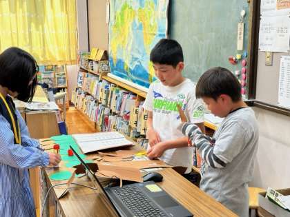 休み時間、ふと図書室の前を通り過ぎると、図書委員の子どもたちが図書当番で図書室に来ていました。貸出や返却の対応の合間に掲示物を作るなど、委員会のお仕事をとても頑張っていました。図書委員に限らず、様々な委員会で子どもたちはとてもよく頑張ってくれています。