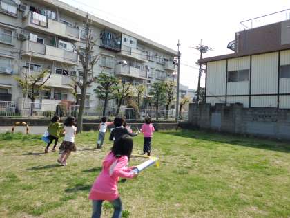 花がたくさん咲いている公園では,ちょうちょうが飛んでいました。みんなは,追いかけながら「ばいばい〜」と手をふりました。