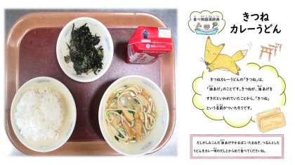 今日の給食は ごはん 牛乳 きつねカレーうどん 小松菜とひじきのいためもの です。