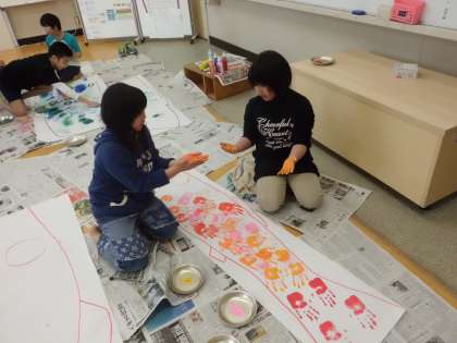 3・4時間目はみんなでこいのぼりを作りました。手に絵の具を塗って、ダイナミックなウロコを表現できました。現在,こいのぼりは教室の掲示板を元気に泳いでおります。