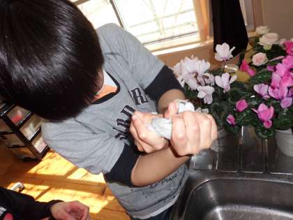 そうじも段々慣れてきました。雑巾も力を込めて絞れています。