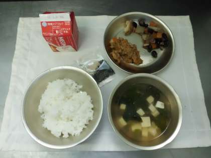 今日の給食は,そぼろ丼・牛乳・黒豆の五目煮・とうふの吉野汁でした。そぼろどんぶりは,たまねぎ・しいたけ・しょうがのみじん切り・にんじんの千切りとまぐろフレークをいためて甘辛く味付けしたものをごはんにのせて食べます。きざみのりもかけてたべました。黒豆の五目煮は黒豆の苦手な児童も多くいましたが,頑張って最後まで食べました。