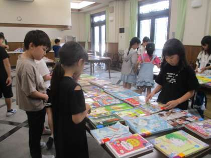 ランチルームにたくさんの新しい本が!図書室にどんな本を置いてほしいか選ぶ選書会が開かれました。面白そうな本がたくさんあり、選ぶのが難しそうでしたが、自分の好きなジャンルの本をそれぞれ選んでいました。
