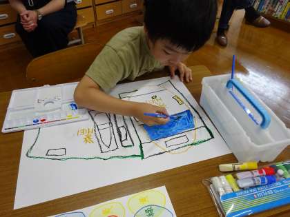 濃淡や色の混ぜ方に気をつけて塗ったり、クレパスで描いた線に、絵の具で色をつけたりしました。