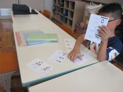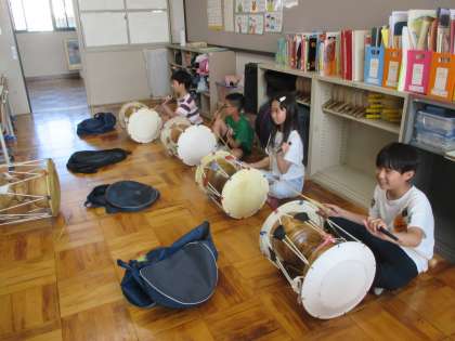 久しぶりのチャンゴ。はじめて体験する3年生に「座り方」や「バチの持ち方」を高学年がていねいに教えていました。授業の終わりごろには全員で楽しくチャンダン(リズム)を叩くことができました。