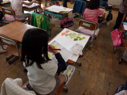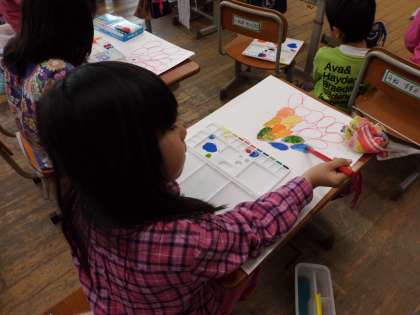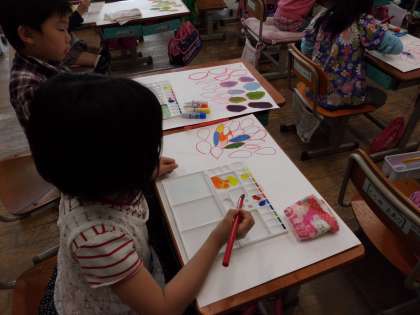 図工の学習で,パレットの使い方や,筆洗,筆の使い方を学習しました。三原色の赤・青・黄・白から,いろいろな色を作りました。