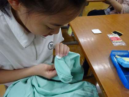 家庭科の学習で、ボタン付けにチャレンジです。