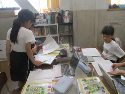 京都市にはいろいろな場所があります。山が多いところや工場が多いところなどグループに分かれて調べながらまとめています。グループでどんなことを調べたらいいのかを相談しながら進めていました。