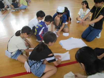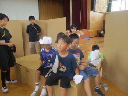 新聞を使ってスリッパやお皿を作ったり、災害用の避難テントの中に入ったり、段ボールベッドに座ってみたりと様々な体験ができました。段ボールベッドでは5人の子どもたちが座ることができ「すごい!」「めっちゃ頑丈!」と驚いていました。