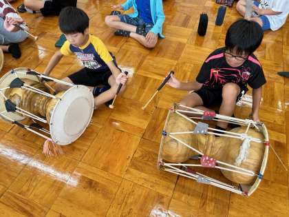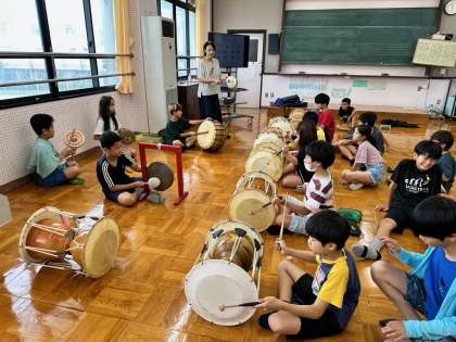 今日は、7月のにこにこ学習がありました。今月のにこにこ学習のテーマは、「となりの国について知ろう」というテーマで、コリアの音楽の文化について体験を通して学習しました。今回は、コリアのお祭りなどで使用されるチャンゴを中心に様々な打楽器に挑戦しました。始まる前から、叩きたくて我慢できないといった様子の子どもたちだったので、学習が始まり、先生からたたき方やたたくリズムを教わると、とても楽しそうにチャンゴの力強い音色を響かせていました。