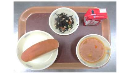 今日の給食は コッペパン(国内産小麦100%) 牛乳 チキンカレーシチュー ひじきのソテー です。