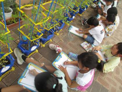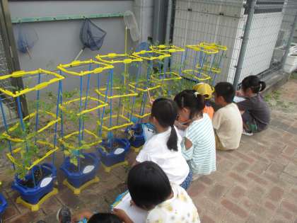 ミニトマトの実を観察しました。数が増えていたり,大きさが大きくなっていたり,ミニトマトの成長が感じられました。赤くなるのが楽しみですね。
