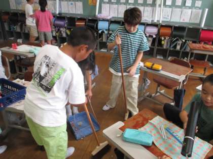 4時間目の授業終わりに筆箱が床に落ちて、鉛筆の削りカスが散らかってしまうということが起こりました。授業中だったので、「後で片付けましょう。」と言っていたのですが、授業終わりに周りの子たちがほうきとちりとりを持ってきて片付けを手伝ってくれました。