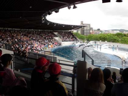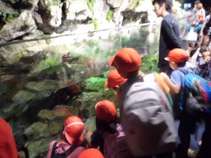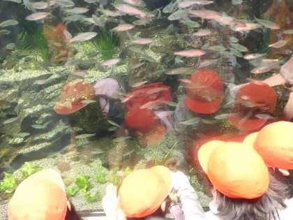 京都駅から京都の町を見学した後,京都水ぞくかんにいきました。水ぞくかんでは,水の中の生き物をかんさつしました。はじめにイルカのショーを見ました。イルカがジャンプした時には,みんなびっくりしてはくしゅをしました。イルカはお話ができないため,ジェスチャーで人間と会話をすることもしりました。また,かんないの水そうには,海の魚や川の魚がたくさんいました。とてもうつくしいおよぎやすがたに,子どもたちはうっとりと見とれていました。「魚のおよぎ方が,下から見られた。」「ネコザメをさわったら,ざらざらしていた。」とかんそうを発表していました。