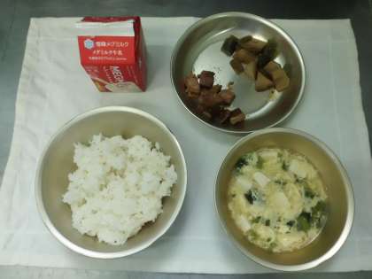 今日の給食は,胚芽米ごはん・牛乳・なま節とふきの煮つけ・かきたま汁でした。