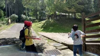 午前中、2つ目の活動はフライングディスクゴルフです。フリスビーを使ったゴルフで、何投でゴールまで行けるか競います。まっすぐ飛ばせるときもあれば、思いもよらぬ曲がり方をするときも。グループでいっしょに楽しむ姿が見られました。