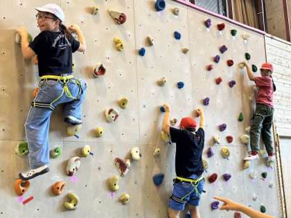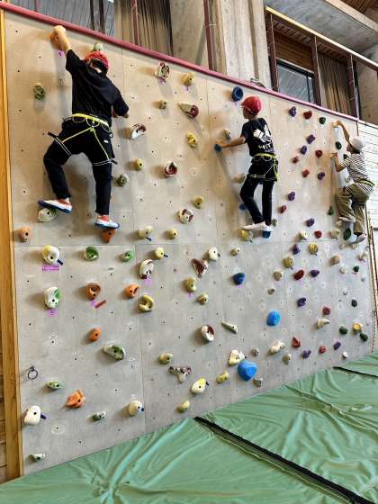 午後の活動がスタートしました。最初の活動はボルダリング・クライミングです。壁に設置された数々のホールドをつかんだり、足がかりにしたりして上を目指します。友だちのチャレンジを応援する声がプレイホールに響き渡っていて、とてもあたたかいつながりを感じることができました。