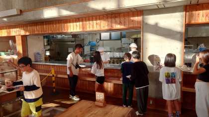 入浴のあと、山の家での最後の夕食。準備から後片付けまで自分たちでできるようになってきました。お腹いっぱい食べて、夜のキャンプファイヤーに臨みます。